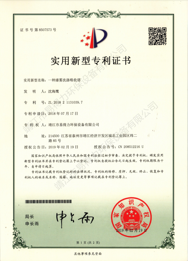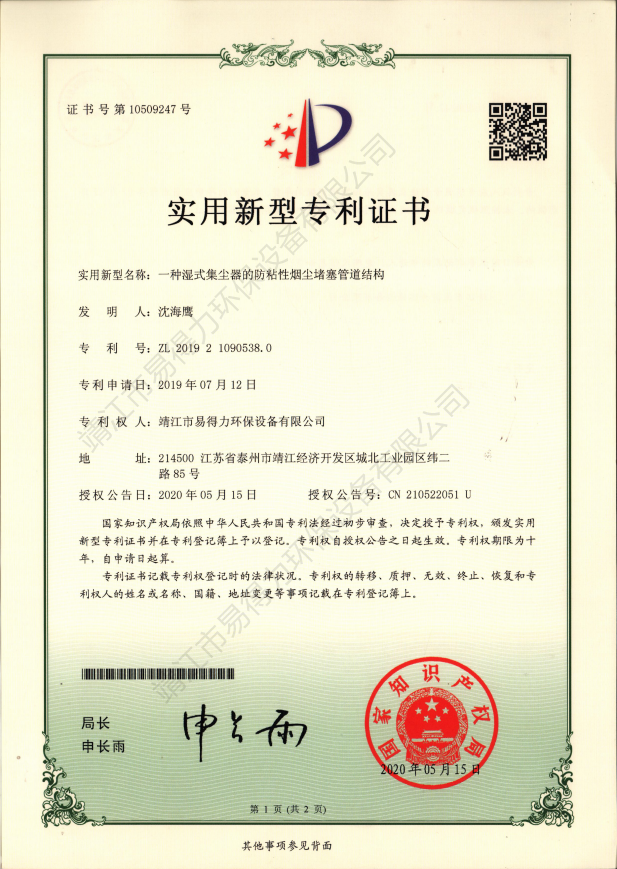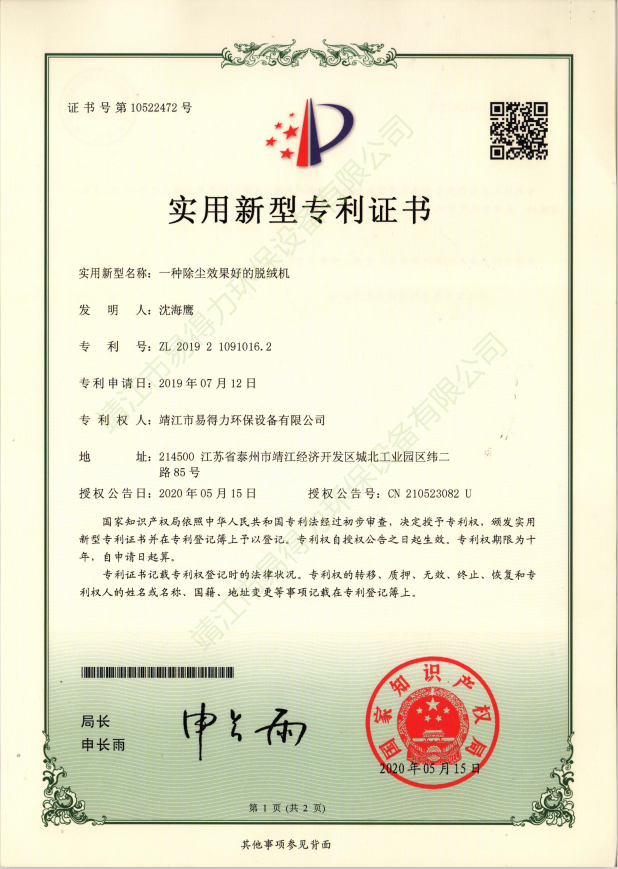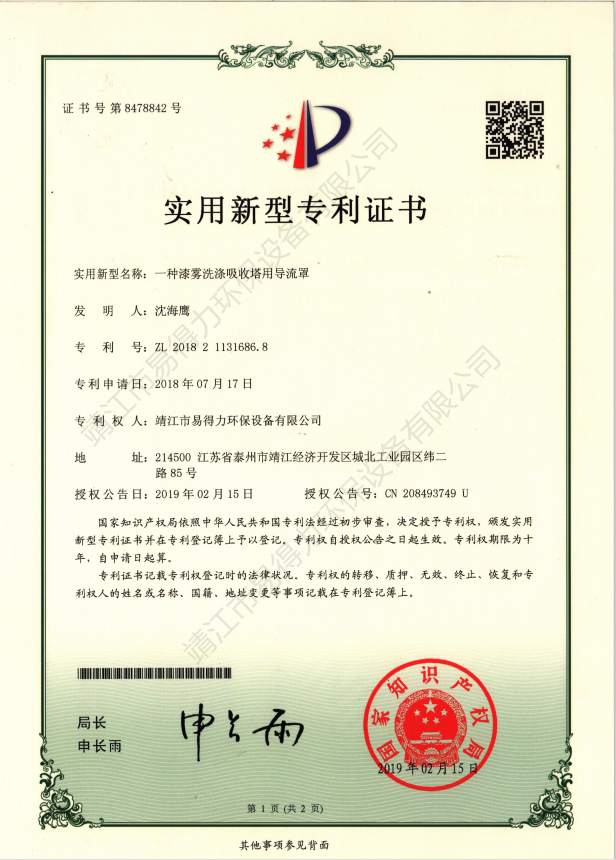 專利證書本公司坐落于開放開發(fā)超前城市江蘇靖江,我們精良優(yōu)秀設(shè)計(jì)團(tuán)隊(duì)始終遵循著創(chuàng)新超越的理念,贏得了中外合資企業(yè)的信賴。易得力環(huán)保設(shè)備有限公司與上海環(huán)科院等科研單位保持合作關(guān)系,不斷加大自身的科研力量,集中了一批國(guó)內(nèi)環(huán)境科技研究和應(yīng)用方面的高素質(zhì)人才,取得多項(xiàng)實(shí)用新型專利證書。…… 查看更多 >>